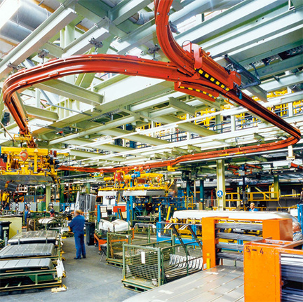 Eine Hängebahn wird zur Beförderung von Lasten verwendet, die an Gehängen zwischen verschiedenen Arbeitsposten des Bedieners befestigt sind.